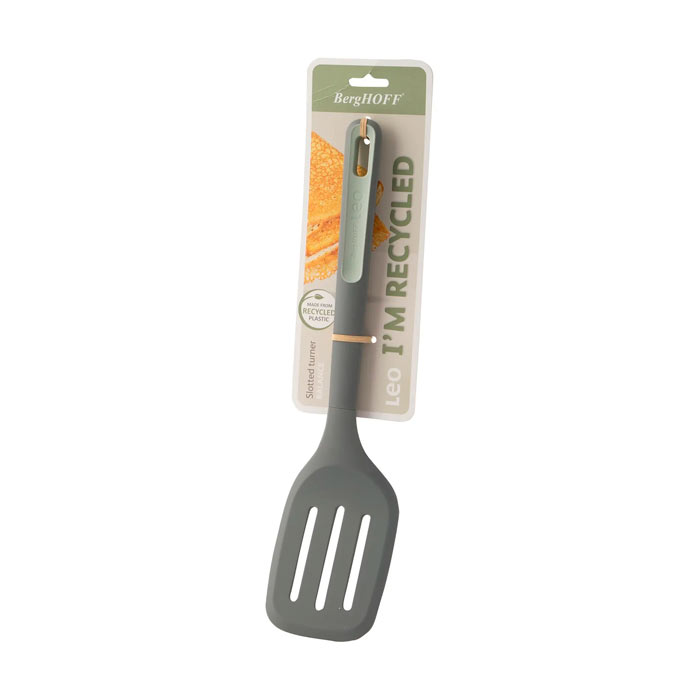 Voltear hamburguesas o panqueques, freír huevos o quitar galletas de una bandeja para hornear galletas, es pan comido con este volteador ranurado hecho en parte de plástico reciclado. Su cabezal de silicona resistente al calor, hecho con plásticos reciclados, con borde delgado y flexible se desliza fácilmente debajo de todos los alimentos y es seguro para su uso en utensilios de cocina con revestimiento antiadherente. Las tres ranuras permiten que el exceso de líquido y aceite se drene de la comida. Una vez que haya terminado, el volteador ranurado puede ir al lavavajillas para una limpieza rápida, después de lo cual el orificio en el mango permite un almacenamiento colgante conveniente.